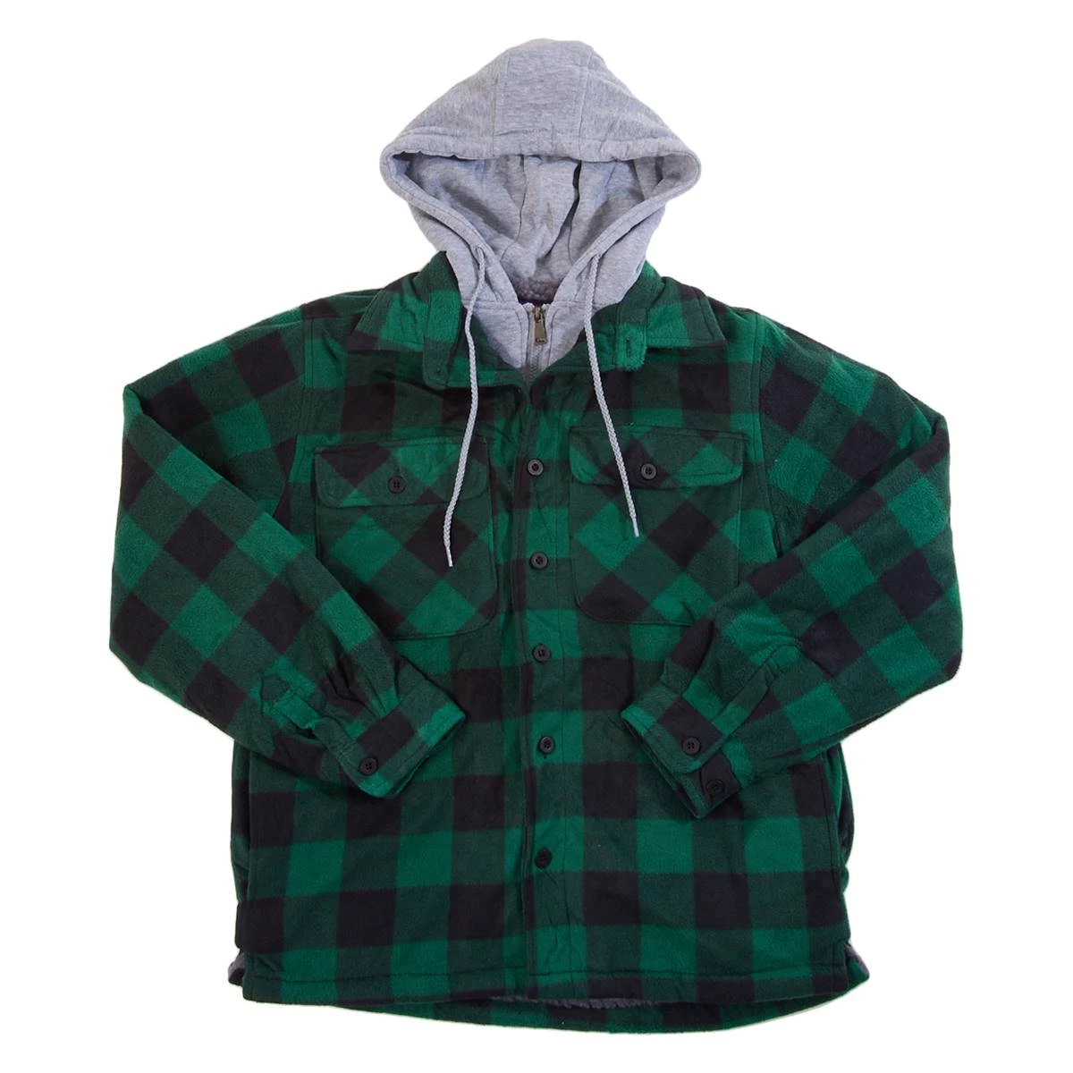 Update your cold weather apparel with this Young Mens Architect® Jean Co. Nordic fleece lined shirt jacket. The jacket features a plaid exterior with button closure, fleece-lining, two chest pockets, two side pockets, a hoodie interior with zip closure, and a drawstring hood.