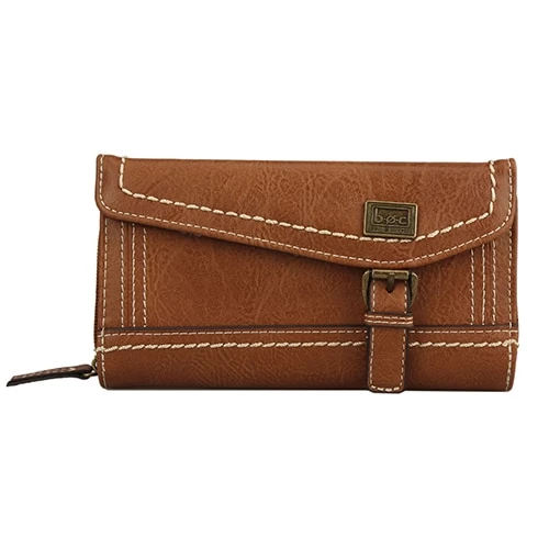This B.O.C. Amherst checkbook wallet features a snap and zipper closure, multiple credit card storage, a zipper coin pocket and bill pockets.