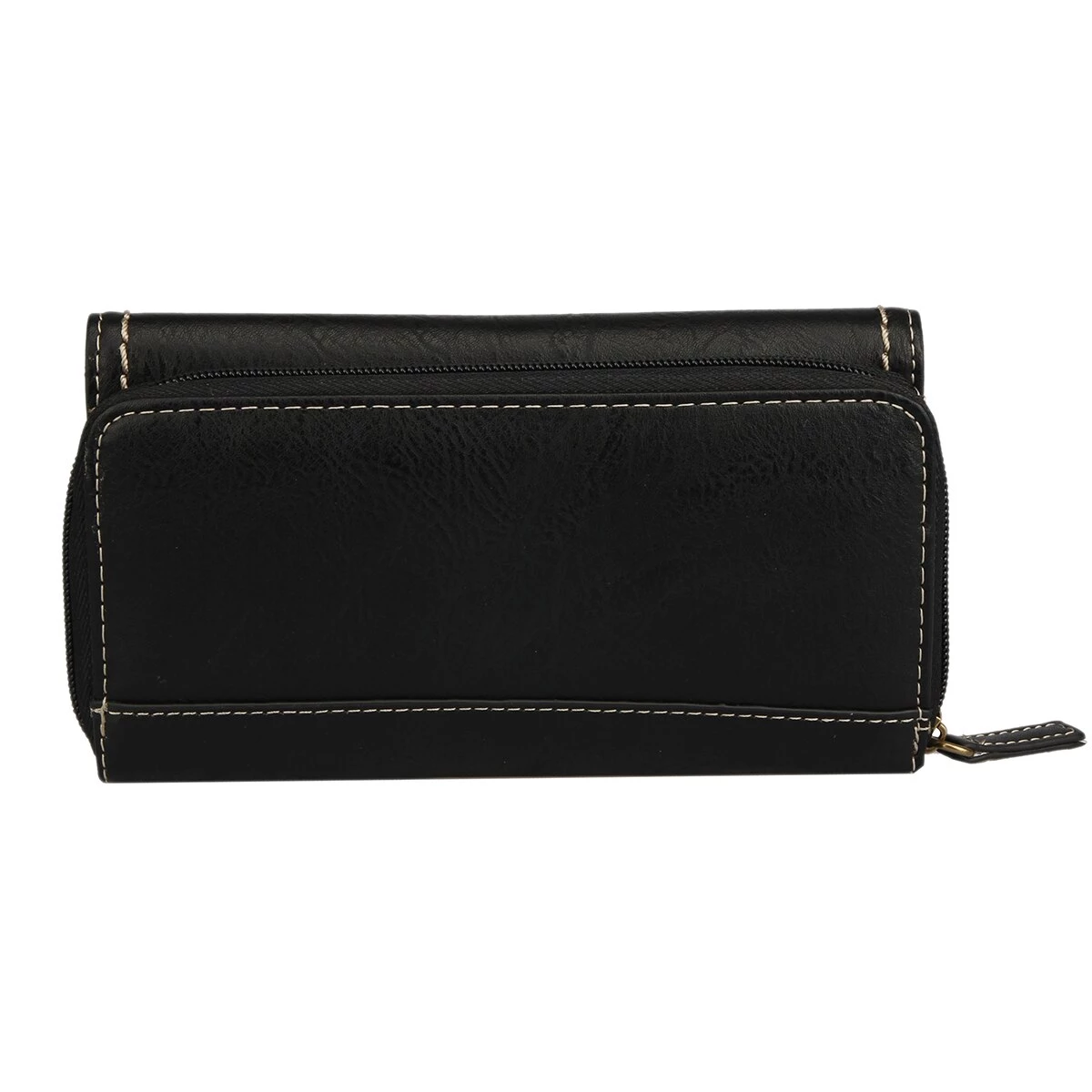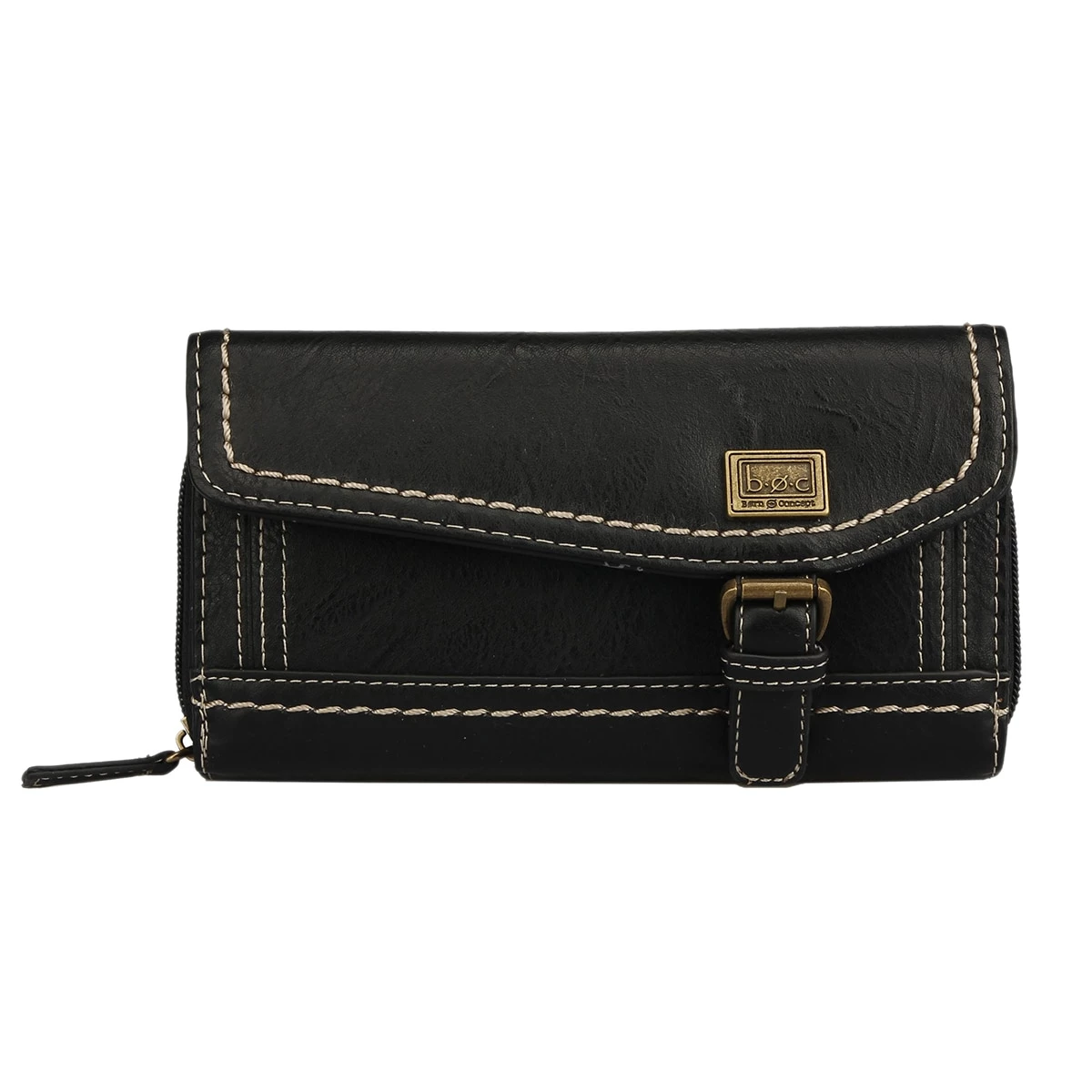 This B.O.C. Amherst deluxe wallet with snap closure features zip pocket, two zip pockets, six slip pockets, and 12 credit card slots.