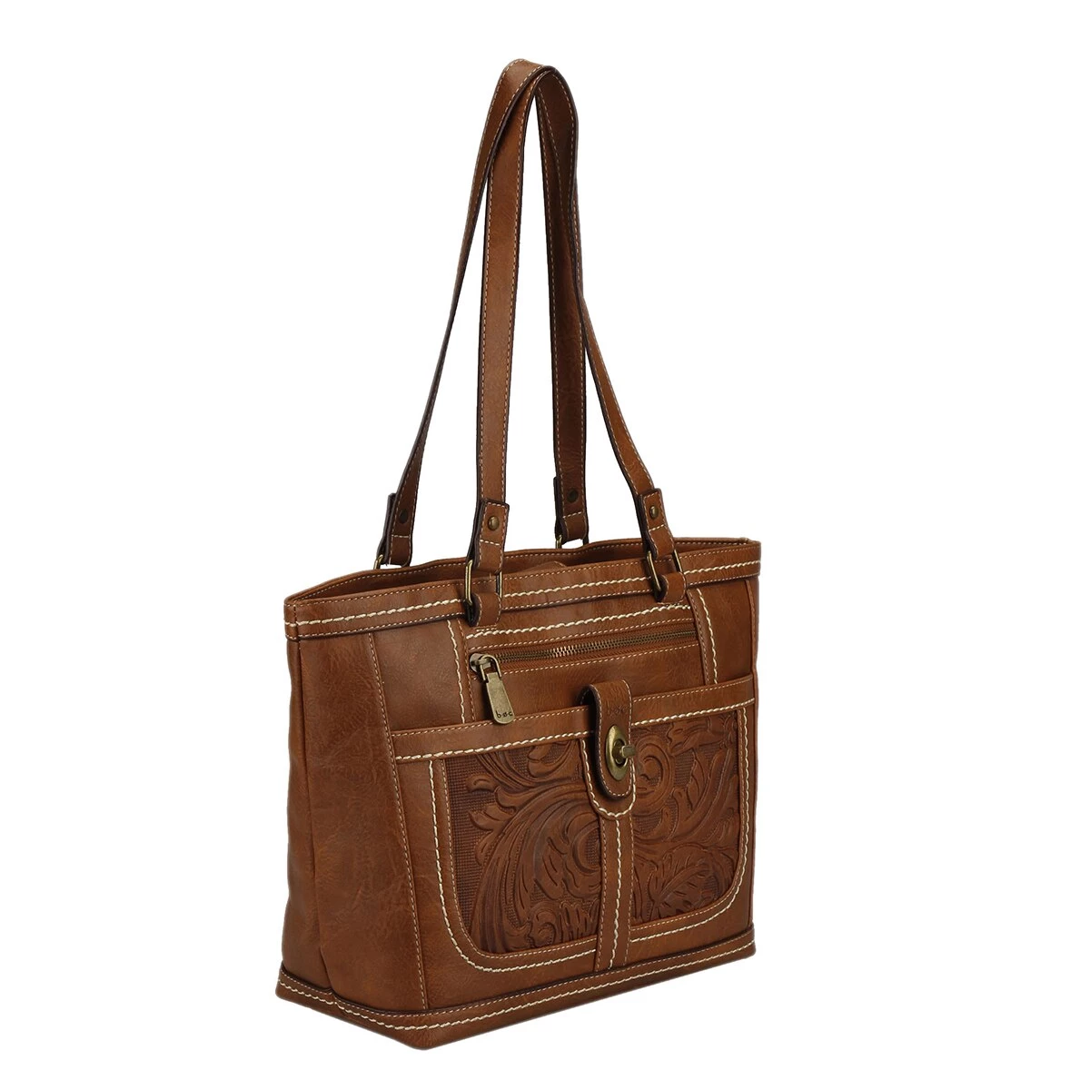 Cary everything you need for the day in this B.O.C. Litchfield tote with tooling front panel detail Features faux turnlock hardware, dual shoulder handles, magnetic snap closure, front slip and zip pocket, four interior pockets, and logo lining.