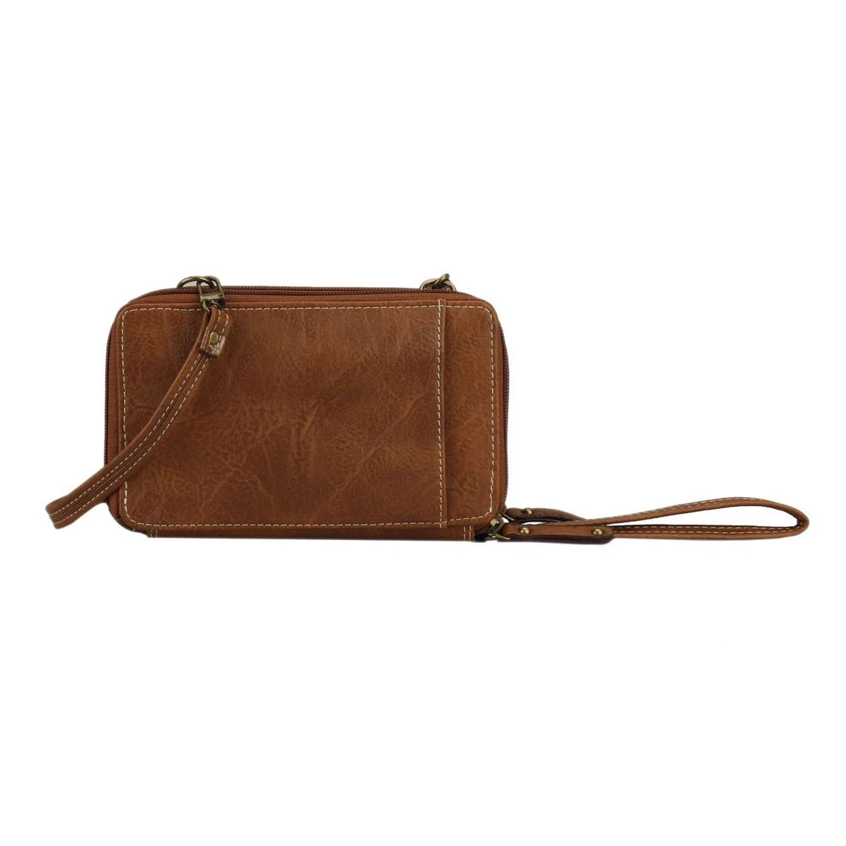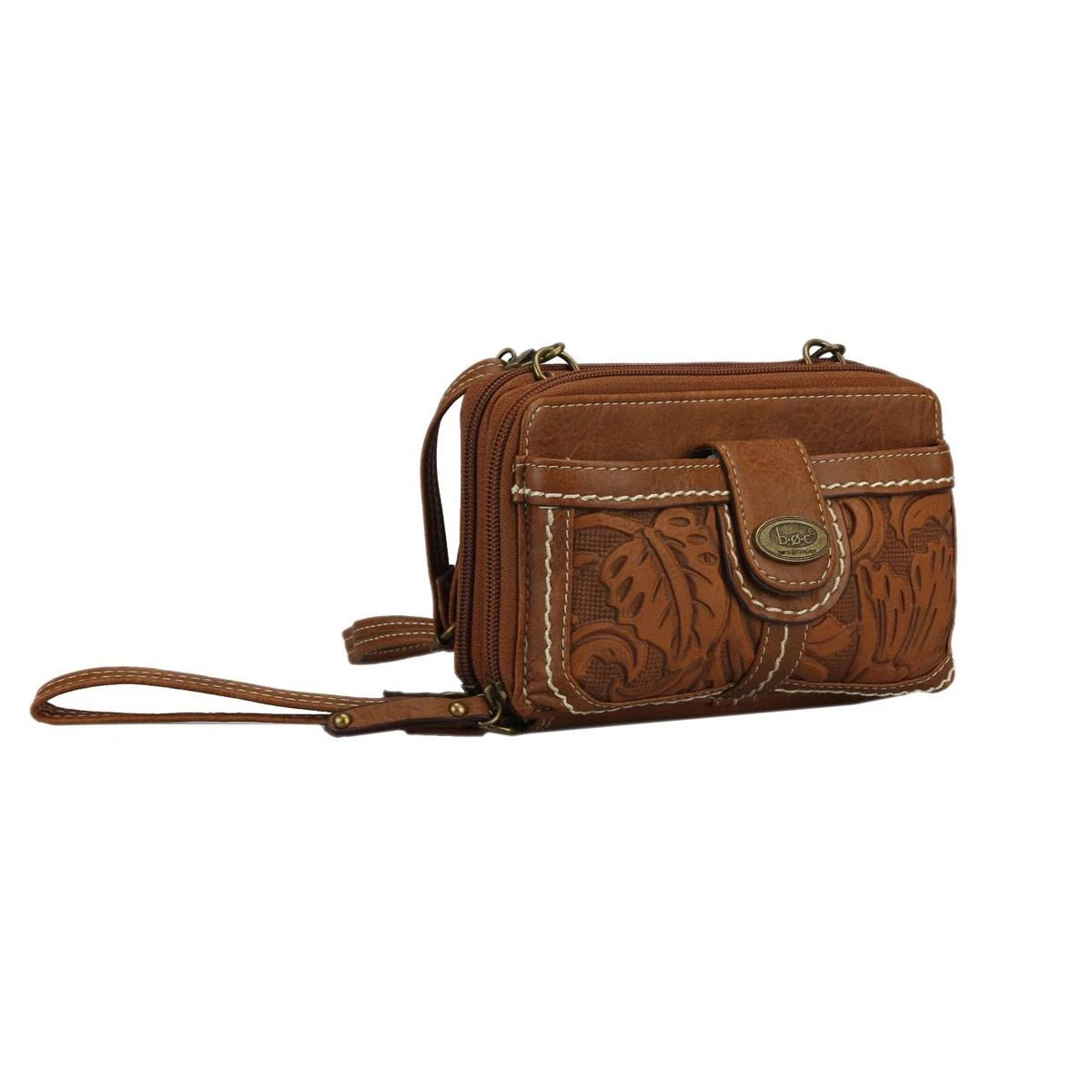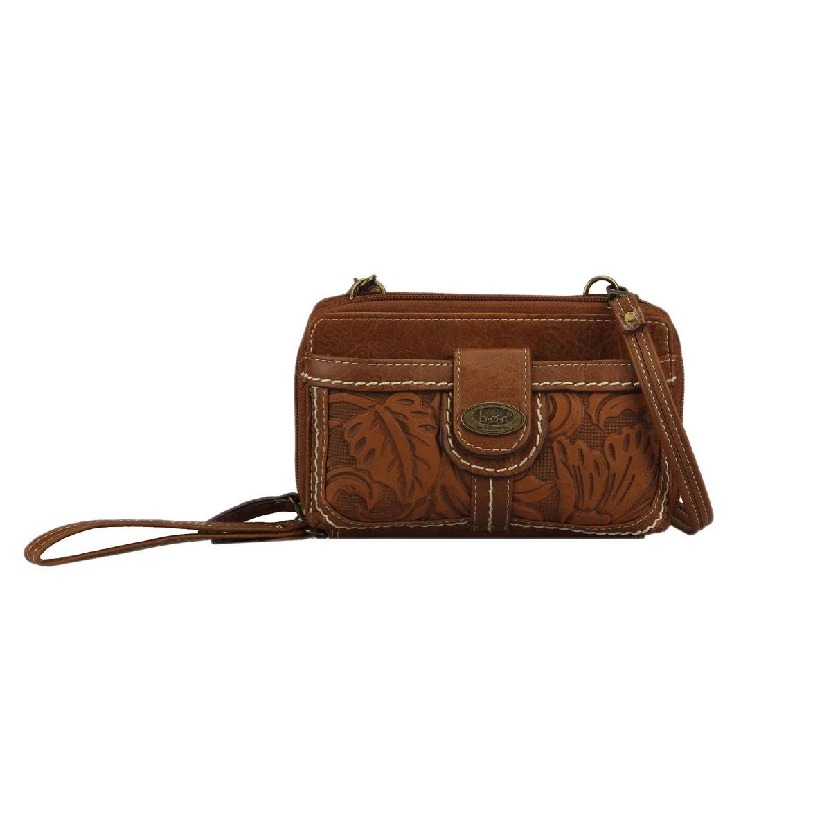 Keep your money essentials secure while you enjoy the day handsfree with this B.O.C. Litchfield cell phone wallet. This floral tooled wallet includes dual zip around closure, a wristlet strap, a removable and adjustable crossbody strap, a back slip pocket, a front phone pocket, an interior zip coin pocket, an I.D window, and interior card and bill slots.