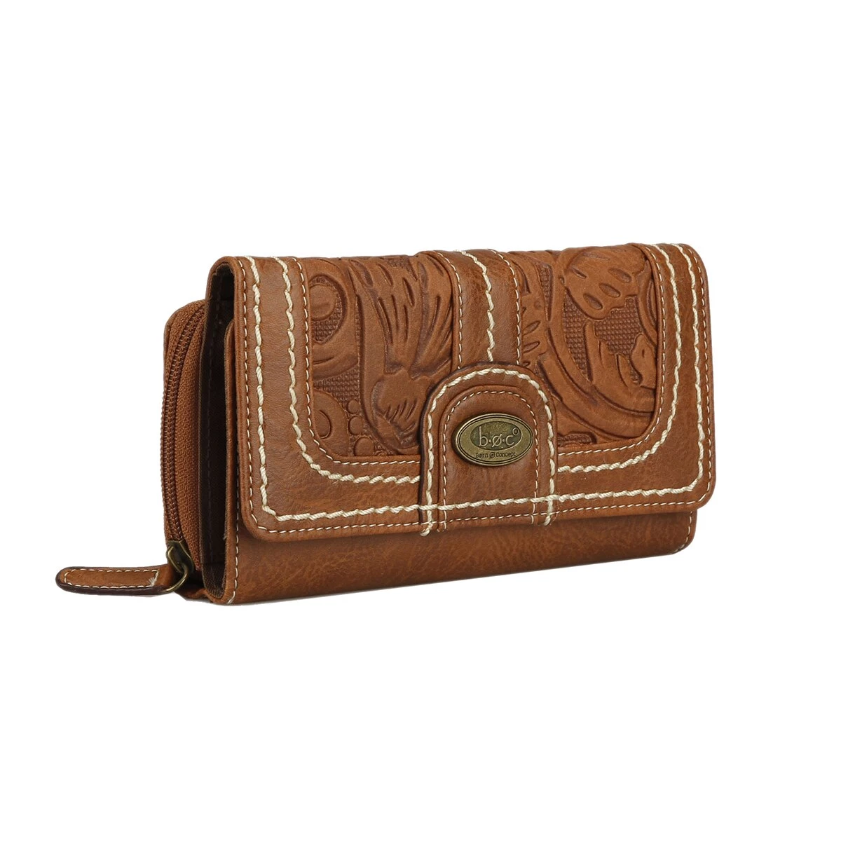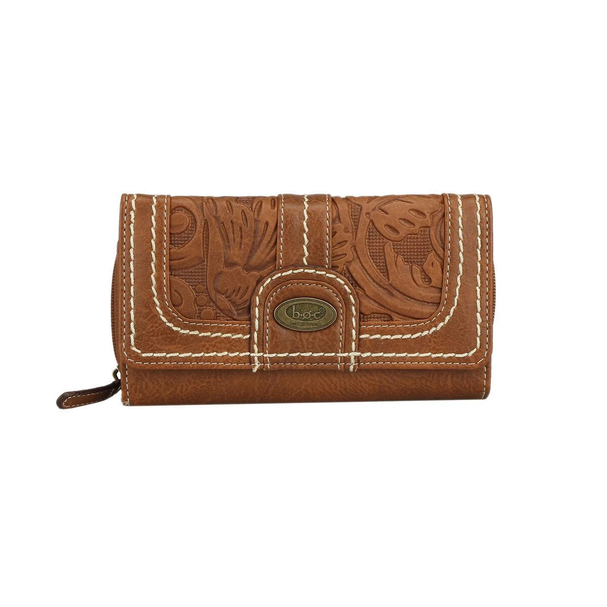 Cash, cards, and coins stay safe and secure in this B.O.C Litchfield wallet. This deluxe wallet with tooling details features a front snap closure, back zip around pocket, credit card slots, I.D. window, and bill and coin zip compartments.