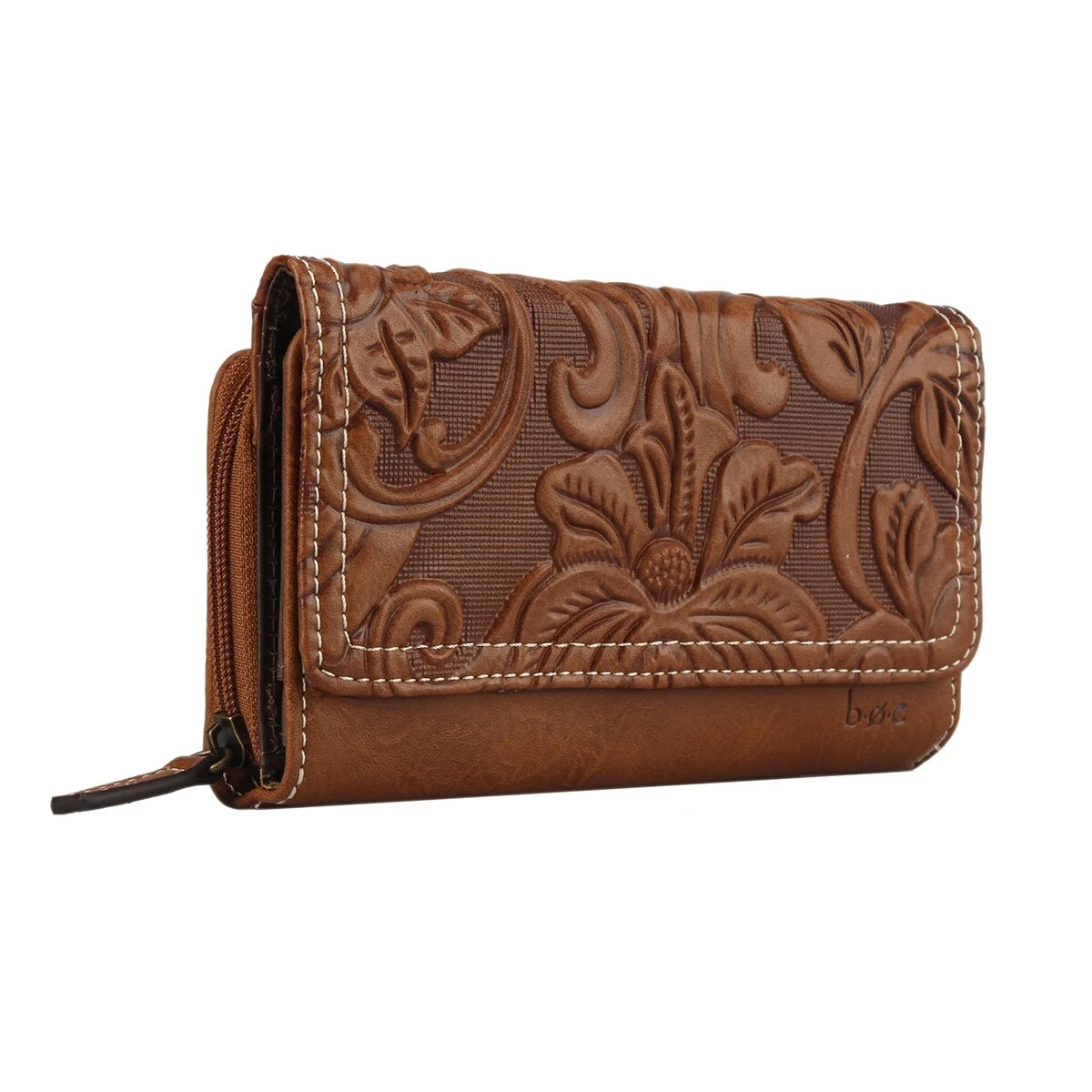 The B.O.C. Millstone deluxe wallet with embossed tooling, front snap closure, back zip-around closure, credit card slots, bill, and coin compartments.