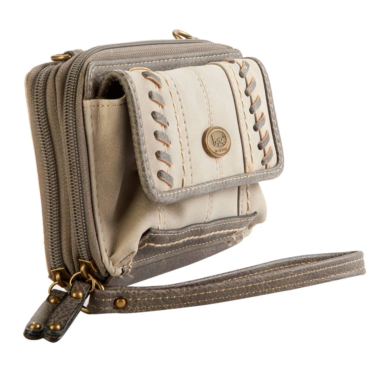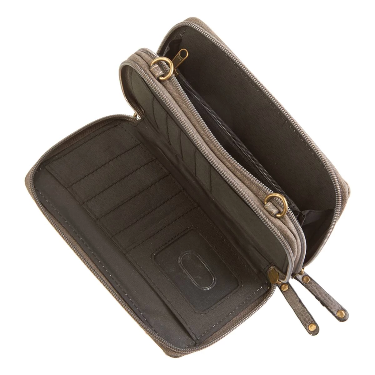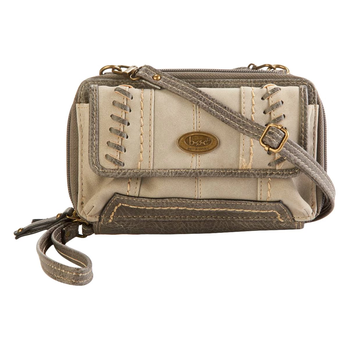 This B.O.C. Oakley cell phone wallet keeps you organized on the go. This wallet features dual zip around closure compartments, removable crossbody and wristlet straps, a front magnetic snap flap pocket, interior pockets, and whipstitch detail.