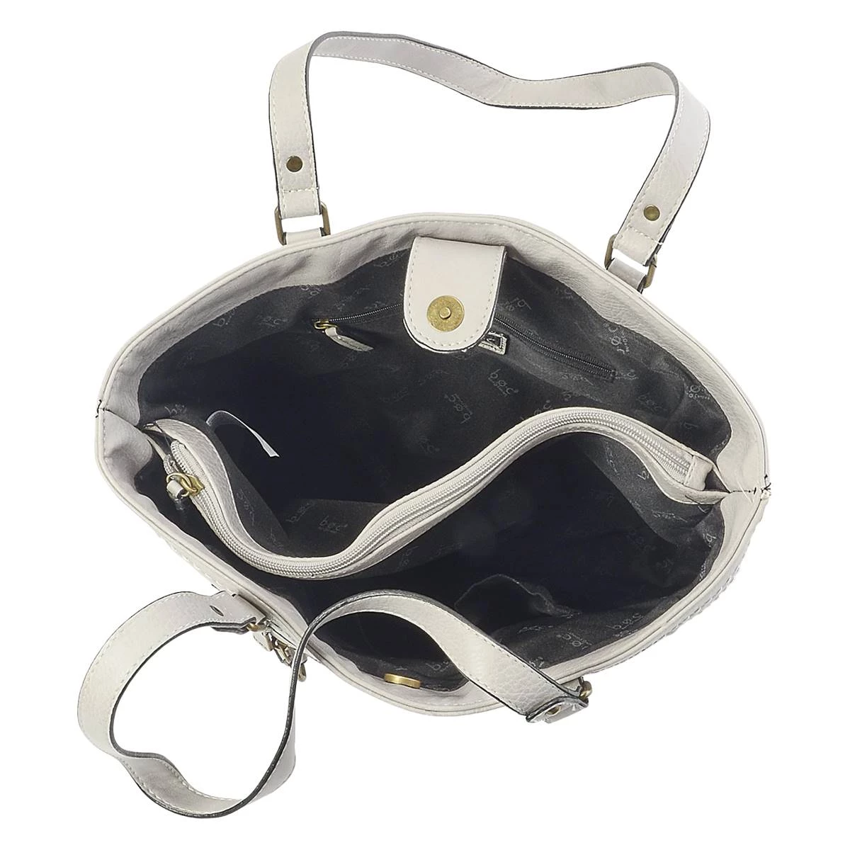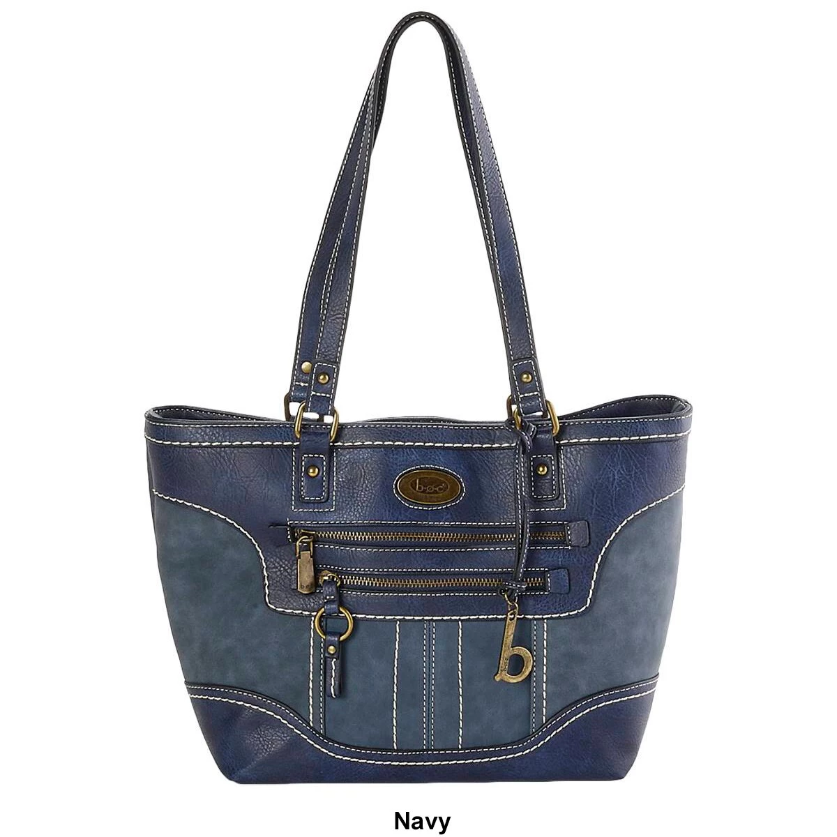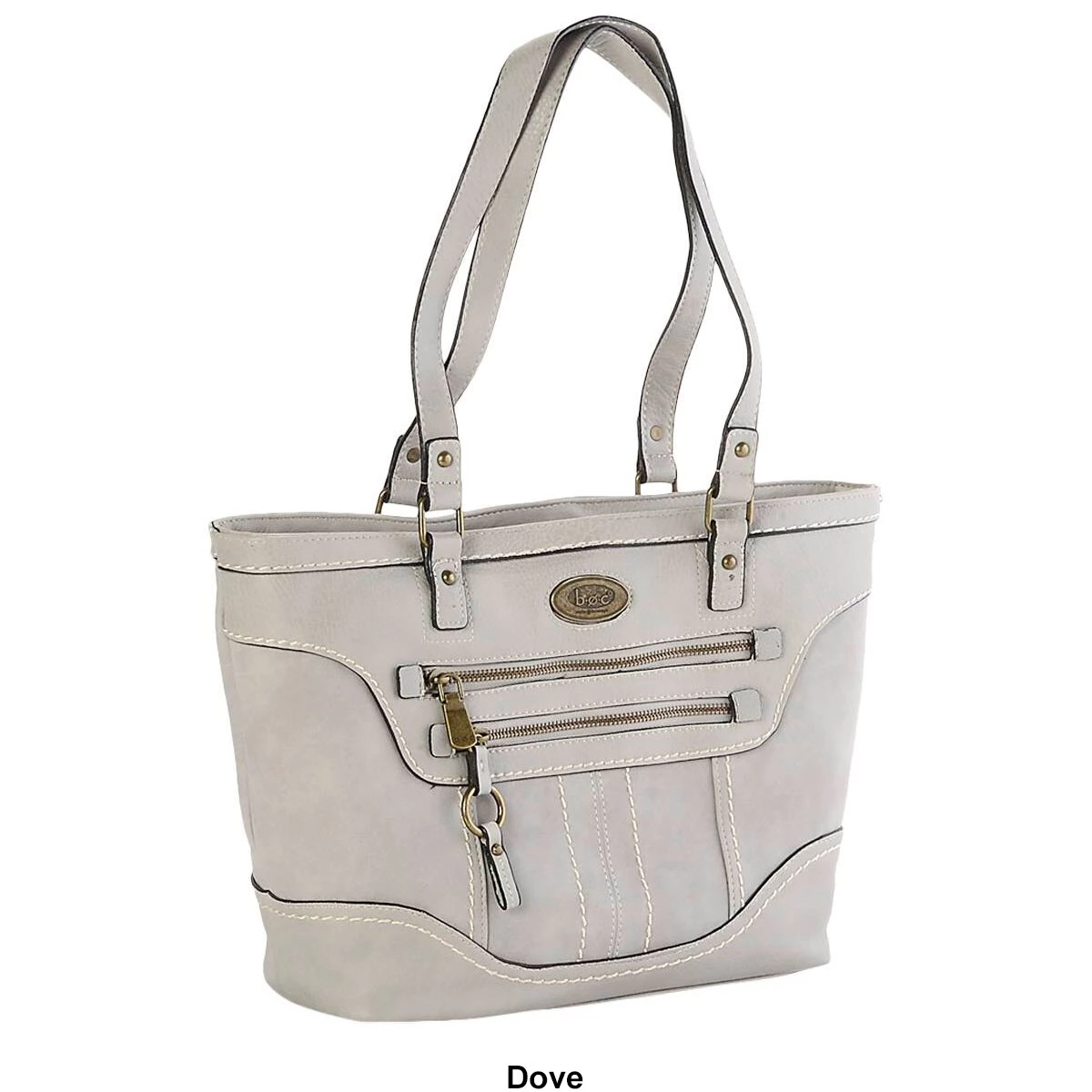 This Trampton Tote features 2 front zip pockets, stitched panel, back zip pocket, double shoulder handles, dual compartments, zip closure, and interior zip and slip pockets.