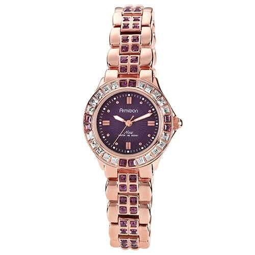 This Armitron rose gold-tone watch features a 27mm case and a bezel set with 20 clear crystals and 8 amethyst colored crystals. The purple Mother of Pearl dial is accented with rose gold-tone markers, luminous hour hands, second sweep, and a printed outer minute track. The rose gold-tone adjustable link bracelet shines with 32 amethyst colored crystals and closes with a fold over clasp with double push-button safety. It also features Japanese quartz movement with analog display and is water resistant to 165 feet. Strap Length: 6.75″.Style 75-3689VMRG.