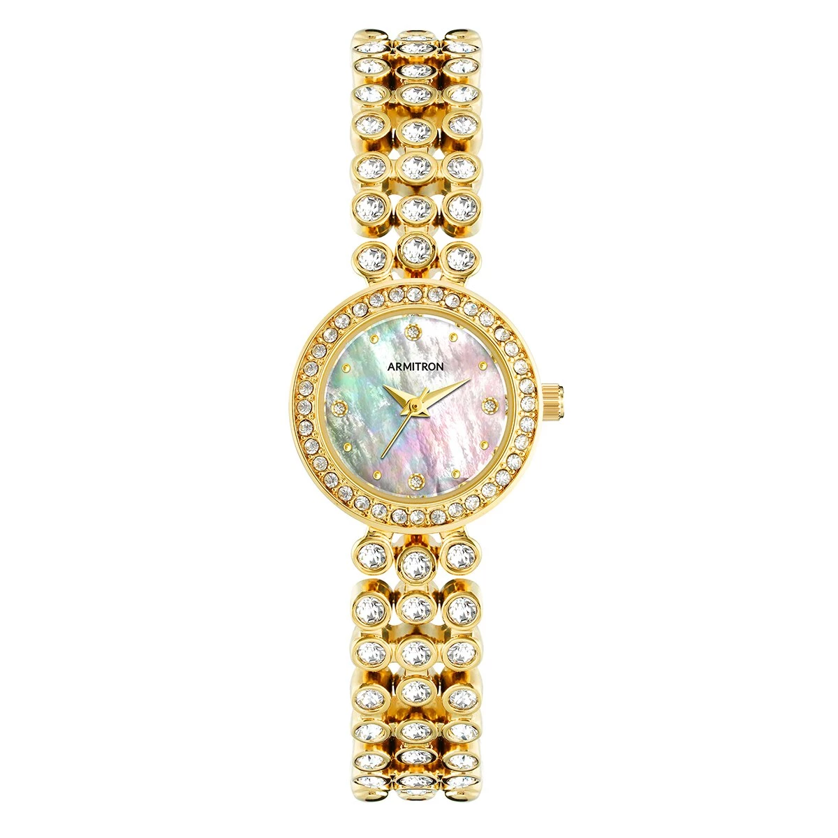 Add some sparkle and style to your wrist wearing the Armitron gold tone crystal bracelet watch with a mother of pearl dial.Band