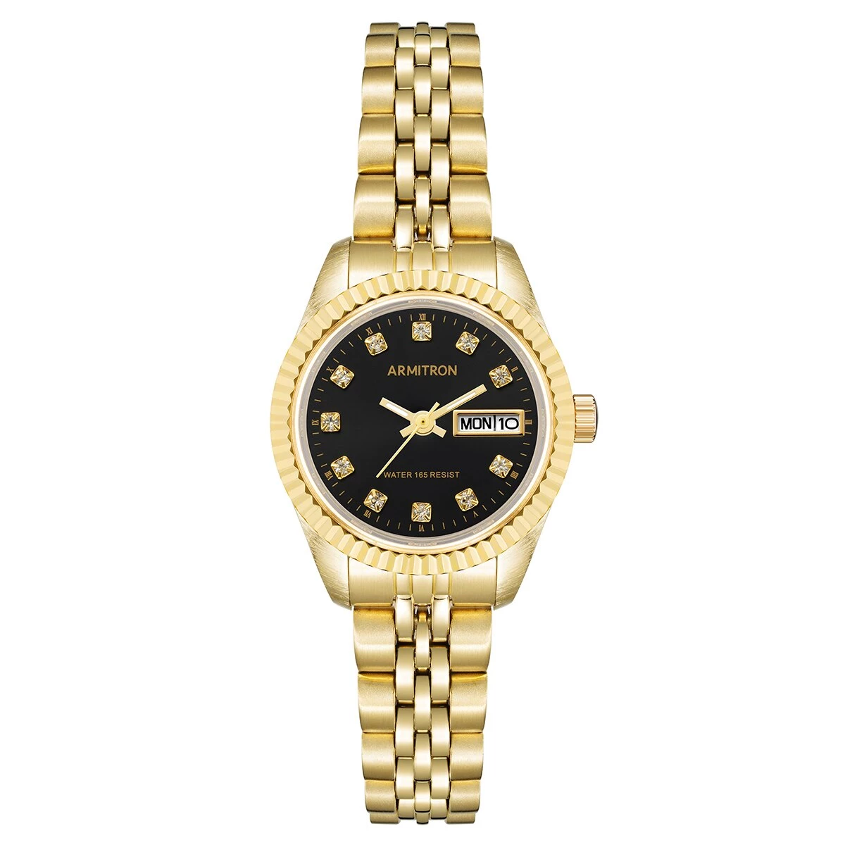 Armitron stunning gold-tone bracelet watch with black dial features crystal hour markers and calendar window.