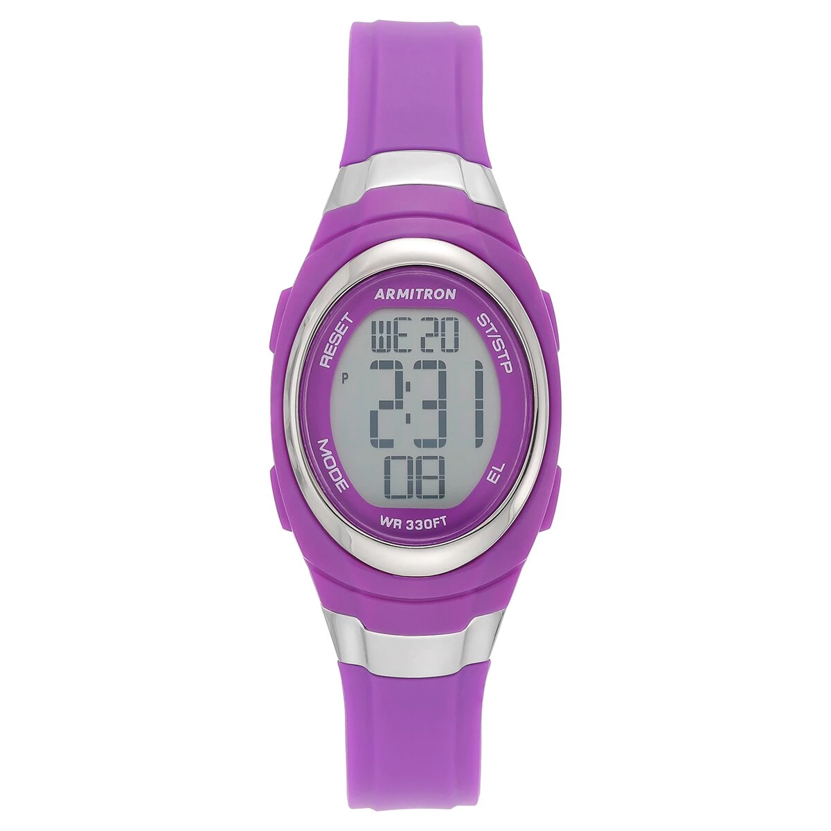 The multifunction quartz movement Armitron oval digital chronograph watch keeps time on your side throughout the day. Crafted with a variety of features including day and date calendar, daily alarm, stop watch, and chronograph this digital watch is designed with a durable soft-touch resin strap and water resistance up to 330 feet.