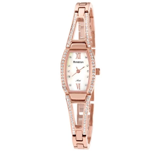 This Armitron rose gold-tone watch features an organic shaped case and the bezel is set with 30 clear crystals. The Mother of Pearl dial is accented with 10 clear crystal markers, rose gold-tone Roman numerals and hands. The rose gold-tone bangle is set with 60 clear crystals, has adjustable end links and closes with a jewelry clasp. This Armitron watch also features reliable quartz movement.Style 75-3531MPRG.Limited Manufacturer’s Warranty.