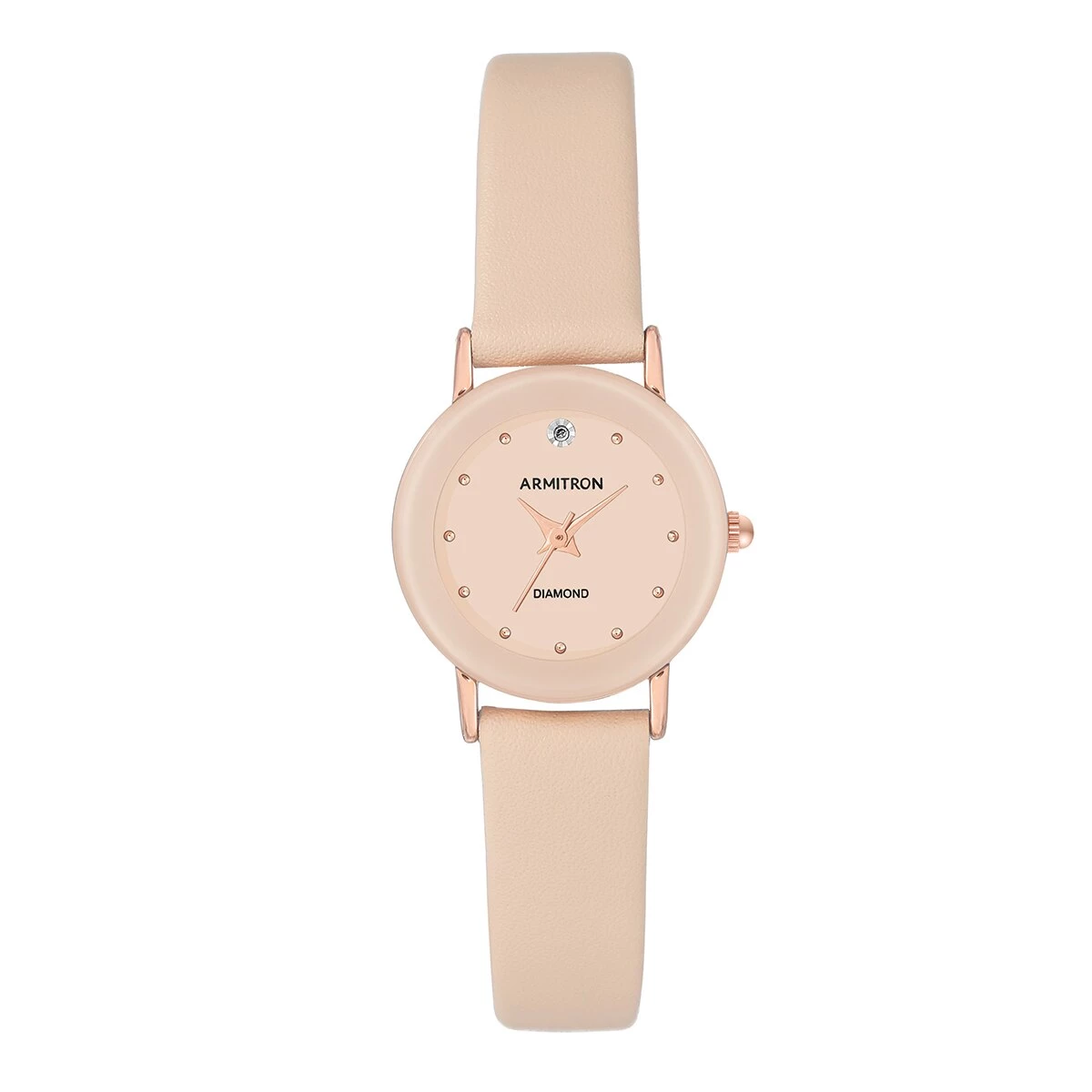 This Armitron genuine leather watch features a round blush case with a wall-to-wall mineral crystal lens. The glossy blush dial is accented with a genuine diamond at 12 o’clock, rose gold-tone hands, and markers. The strap closes with a rose gold-tone buckle. The watch also features reliable Japanese quartz movement.
