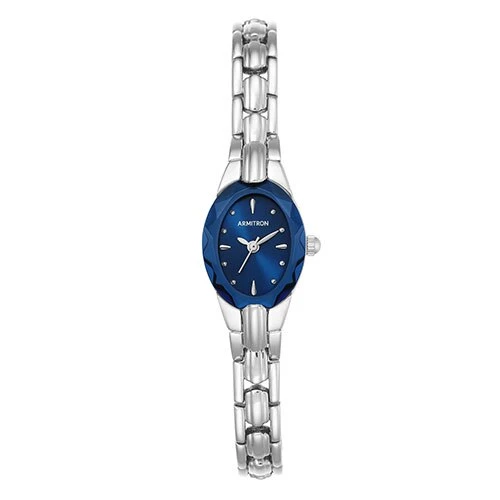 This Armitron silver-tone bracelet watch features a 17mm case and blue dial with silver-tone hour markers.Style 75-3313BLSV.Limited Manufacturer’s Warranty.
