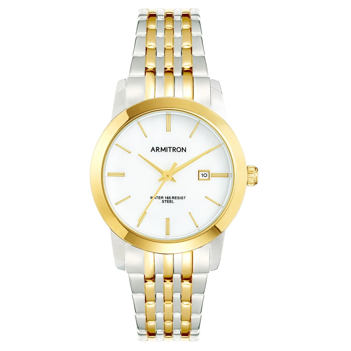 The Armitron two tone mother of pearl watch keeps you on time and looking stylish. Features include a sunray dial with a date window and water resistance up to 165 feet.Band