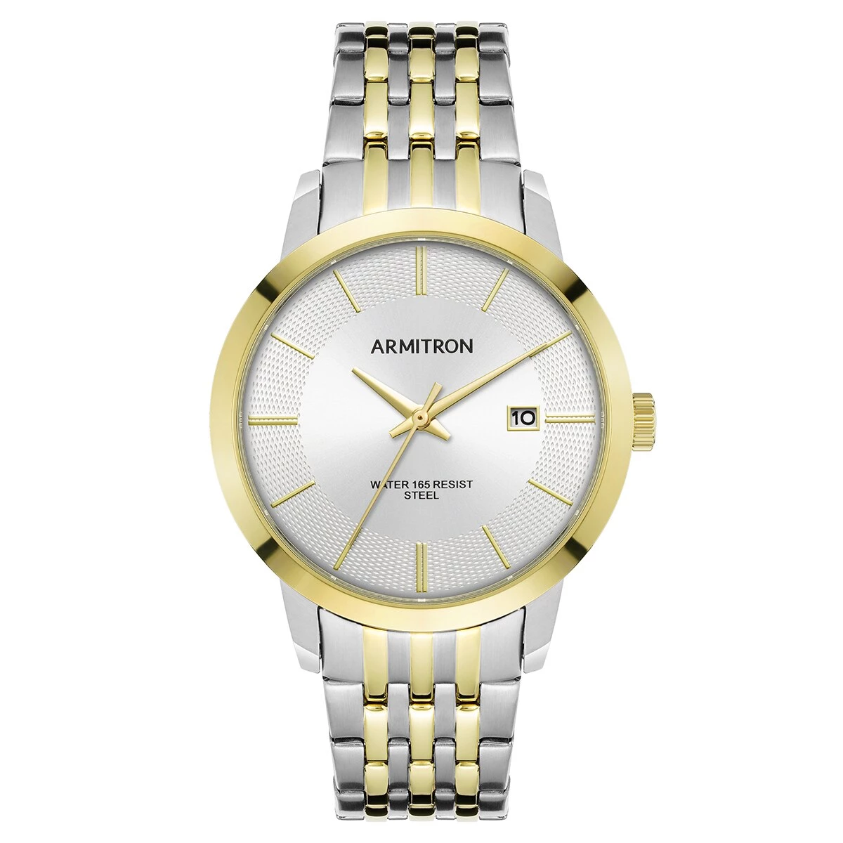 Dress up your wrist wearing the Mens Armitron Classic stainless steel two tone watch. Features include a silvertone sunray dial, date window, and water resistant up to 165 feet.Band