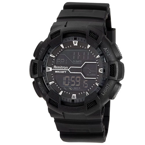 This Mens matte watch features a 47mm case, alarm, chronograph with lap time, backlight, day/date functions, and dual time. The black resin strap has buckle closure. It also features quartz movement with digital display and is water resistant to 330 feet.Strap Length: 7.5″