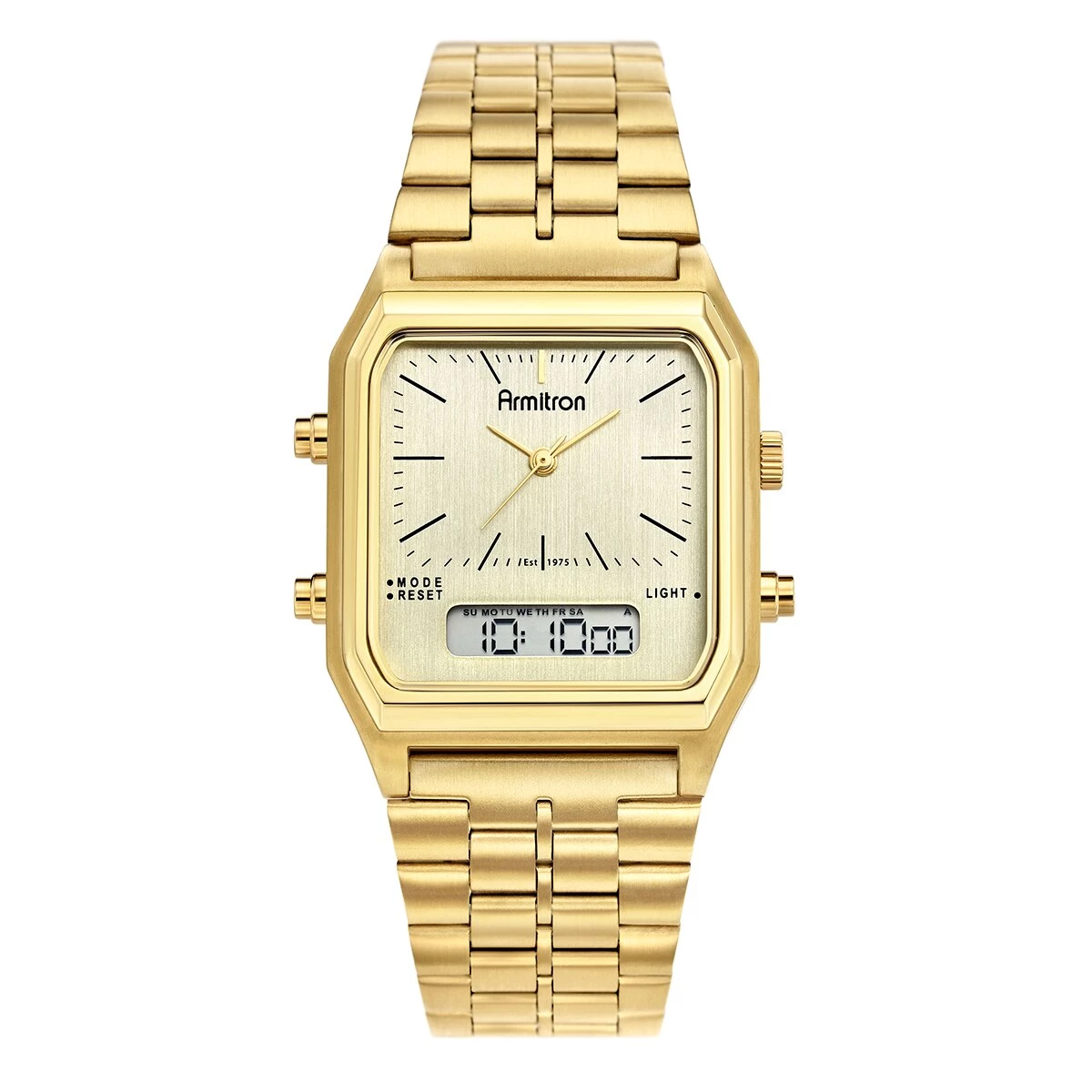 Style and function come together with the Mens Armitron stainless steel gold tone retro AnaDigi watch. Features include both an analog and digital face with a champagne dial.Band