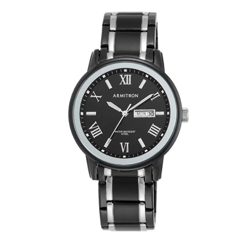 Mens Armitron black IP bracelet watch features a 41mm case with silver-tone crown and dial frame. The dial is a gloss black finish with silver-tone Roman markers. There is a day/date function window at the 3 o’clock position and luminous silver-tone hands. The two-tone, adjustable link bracelet is secured with a two-button fold-over clasp. Water resistant up to 165 feet.Style 20-4935BKTB.Limited Manufacturer’s Warranty.