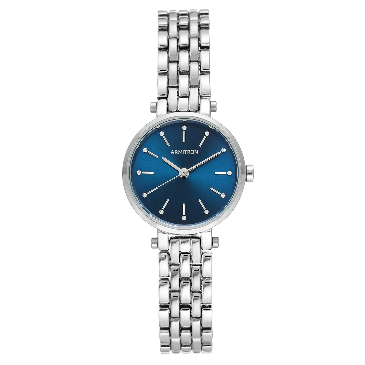This Womens Armitron silver-tone bracelet watch features a blue sunray dial and is finished with a Swarovski Crystalยฎ accent at each hour mark.