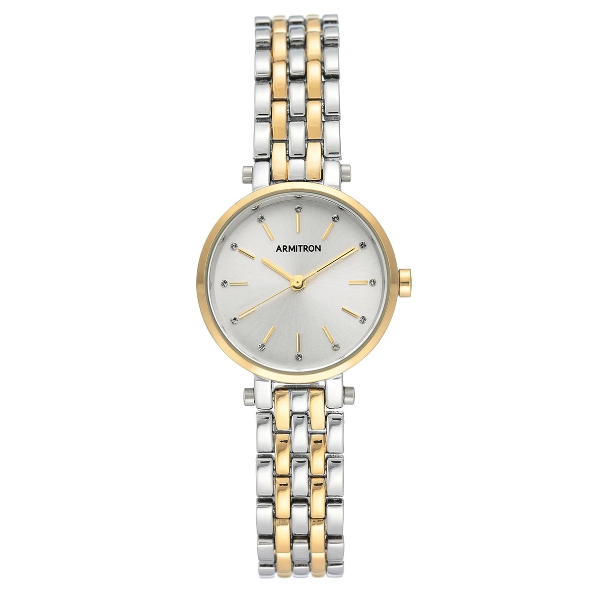 This Womens Armitron two-tone bracelet watch features a Silverstone sunray dial finished in a Swarovski Crystalยฎ accent at each hour mark.