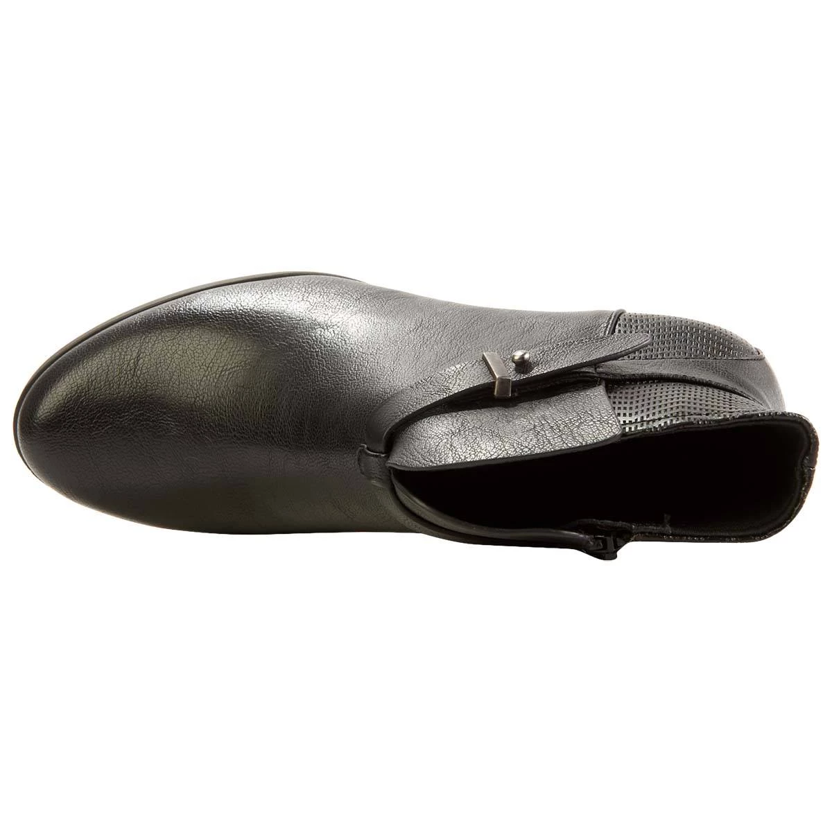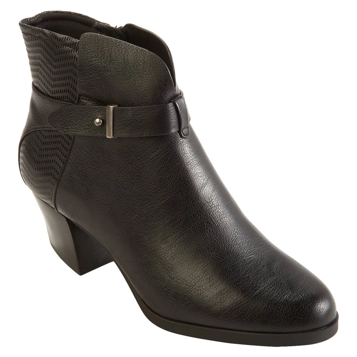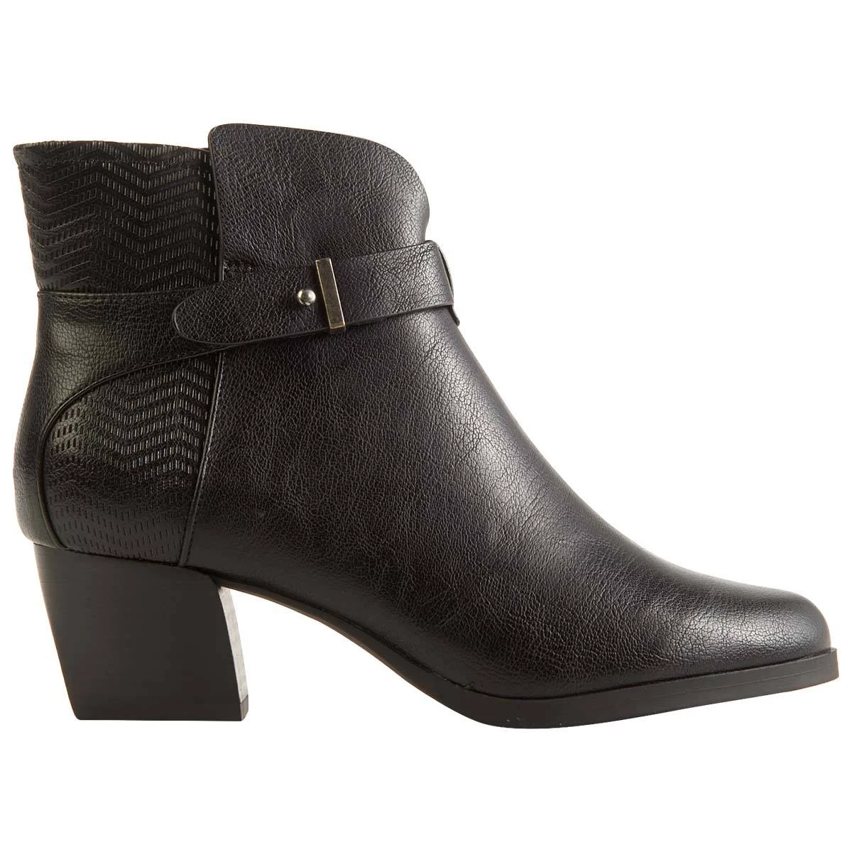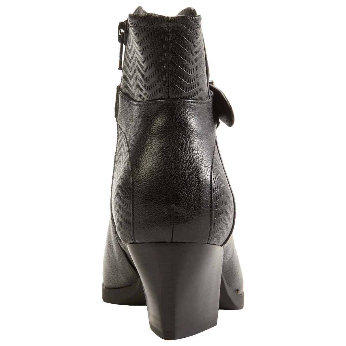 Complete any outfit this season with this chic Womens BareTraps® Lane In Carlsbad ankle boots. With a unique chevron textured design on the ankle, these shoes include a side zipper closure, a lightly padded footbed, block heel, and buckle accent.