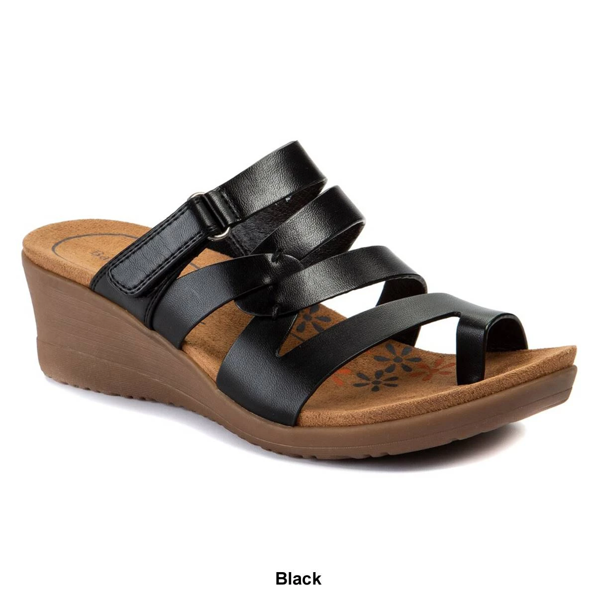 These Womens BareTraps® Theanna Wedge Sandals will set the mood for the whole night. They have a toe hold, overlapping curved straps, hand stitch details, and hook & loop closure for a customized fit.Also available in Wide Widths.