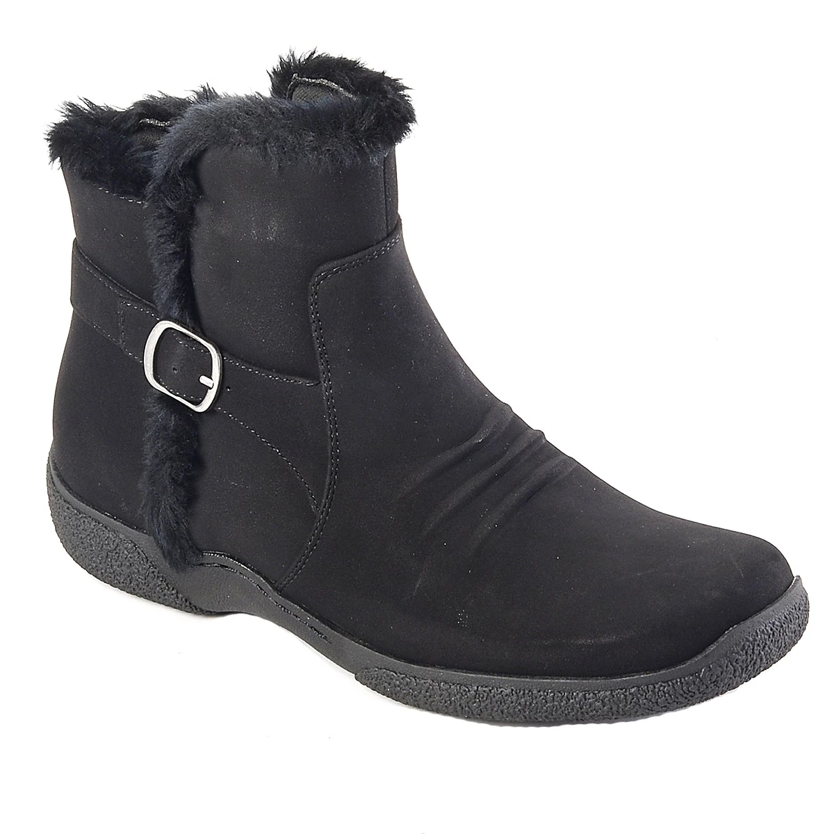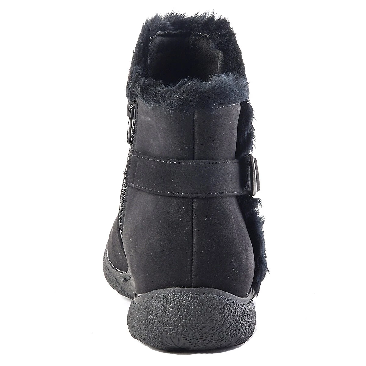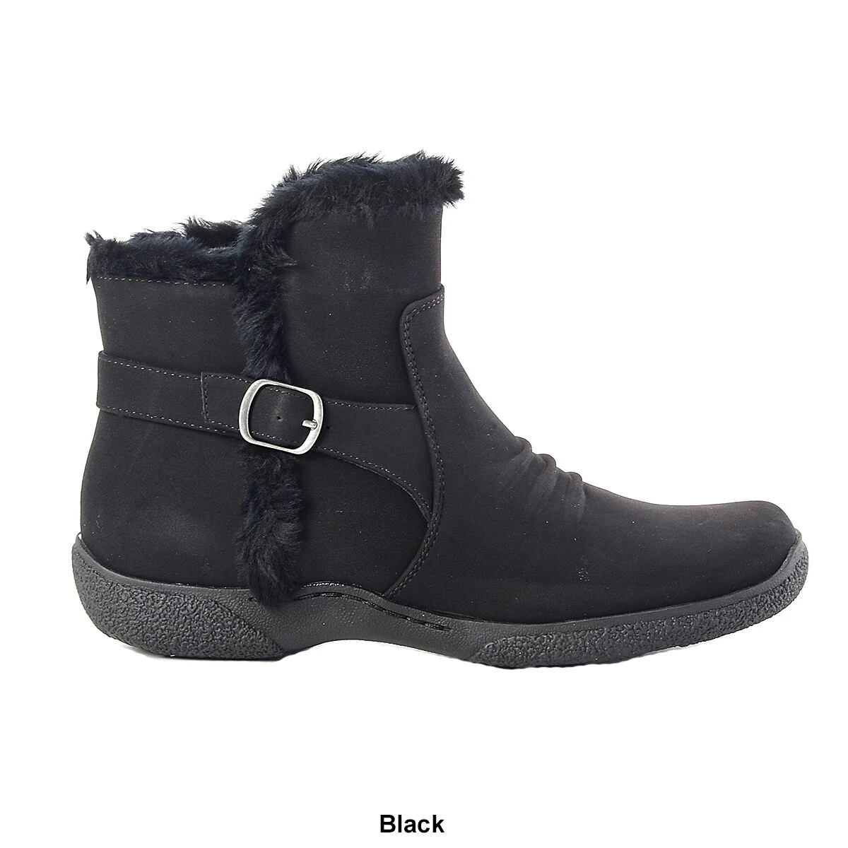 Keep your feet cozy this season with the Womens BTrue by BareTraps® Lyna flat heel ankle boots. Featuring faux fur lining, an adjustable side buckle for that perfect fit, and a durable rubber sole.